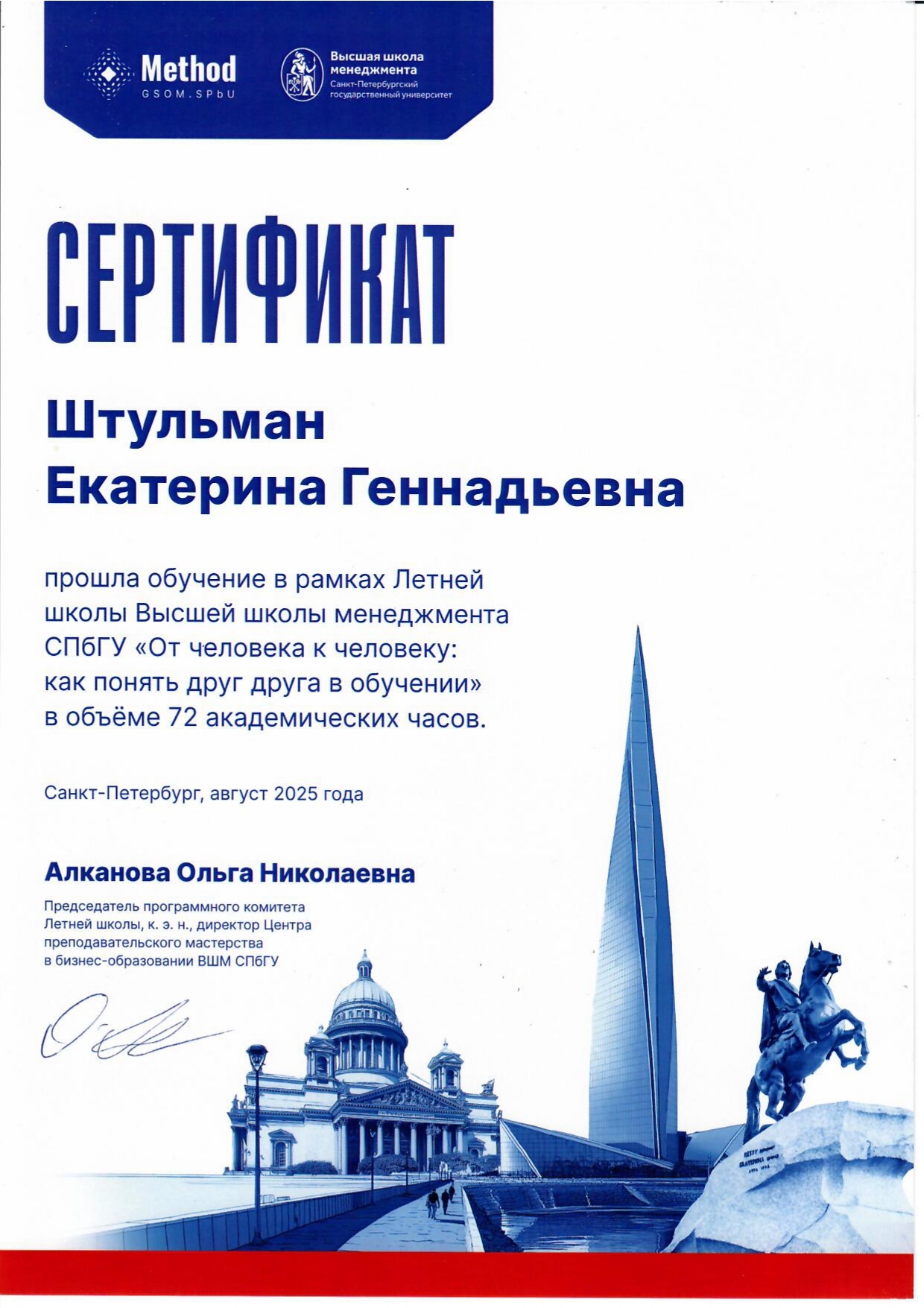 Екатерина Геннадьевна Штульман стала участником IV Летней школы Центра преподавательского мастерства ВШМ СПбГУ (18–23 августа 2025 г.).
